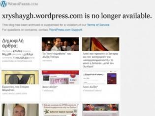 Εδώ και αρκετή ώρα η σελίδα της Χρυσής Αυγής στο wordpress είναι εκτός λειτουργίας Για "ολοκληρωτικό πόλεμο από την ανθελληνική εξουσία" κάνει λόγο η Χρυσή Αυγή σε ανακοίνωσή της, χαρακτηρίζοντας "παραμύθι" το ελεύθερο διαδίκτυο.