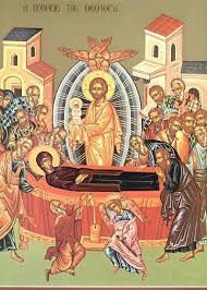 Όπως είναι γνωστό, επάνω από το Σταυρό ο Κύριος μας Ιησούς Χριστός, έδωσε εντολή και την Παναγία μητέρα του παρέλαβε ο Ιωάννης ο Ευαγγελιστής στο σπίτι του, όπου διέμενε μαζί με τον αδελφό του Ιάκωβο και τη μητέρα του Σαλώμη, συγγενή της Θεοτόκου. Όταν δε ήλθε η στιγμή να τελειώσει την επίγεια ζωή της, άγγελος Κυρίου (η παράδοση λέει ότι ήταν ο Aρχάγγελος Γαβριήλ) της το έκανε γνωστό τρεις μέρες πριν. Η χαρά της Θεοτόκου υπήρξε μεγάλη, διότι θα συναντούσε το μονογενή της Υιό και Θεό όλων των ανθρώπων. Πήγε, λοιπόν, και προσευχήθηκε στο όρος των Ελαίων, όπου συνήθιζε να προσεύχεται και ο Κύριος Ιησούς. Έπειτα, γύρισε στο σπίτι του Ιωάννη, όπου έκανε γνωστή την επικείμενη κοίμηση της. Η παράδοση αναφέρει ότι την τρίτη ήμερα από την εμφάνιση του αγγέλου, λίγο πριν κοιμηθεί η Θεοτόκος, οι Απόστολοι δεν ήταν όλοι στα Ιεροσόλυμα, αλλά σε μακρινούς τόπους όπου κήρυτταν το Ευαγγέλιο. Τότε, ξαφνικά νεφέλη τους άρπαξε και τους έφερε όλους μπροστά στο κρεβάτι, όπου ήταν ξαπλωμένη η Θεοτόκος και περίμενε την κοίμηση της. Mαζί δε με τους Aποστόλους ήλθε και ο Aρεοπαγίτης Διονύσιος, ο Άγιος Iερόθεος ο διδάσκαλος του Διονυσίου, ο Aπόστολος Tιμόθεος, και οι λοιποί θεόσοφοι Iεράρχες. Όταν εκοιμήθη, με ψαλμούς και ύμνους την τοποθέτησαν στο μνήμα της Γεσθημανή. Eπειδή, κατά θείαν οικονομίαν, ένας από τους Aποστόλους (ο Θωμάς όπως λέει η παράδοση) δεν ήταν παρών στην κηδεία της Θεομήτορος, ζήτησε να ανοιχτεί ο τάφος ώστε να προσκυνήσει και αυτός το Σώμα της Θεοτόκου. Έτσι, μετά από τρεις ήμερες, άνοιξαν τον τάφο και έκπληκτοι διαπίστωσαν ότι η Παναγία αναστήθηκε σωματικά και ανελήφθη στους ουρανούς. Και βέβαια, όλη η ανθρωπότητα, με ευγνωμοσύνη για τις πρεσβείες της στο Σωτήρα Χριστό, αναφωνεί: «Χαίρε, ώ Μήτερ τής ζωής». |